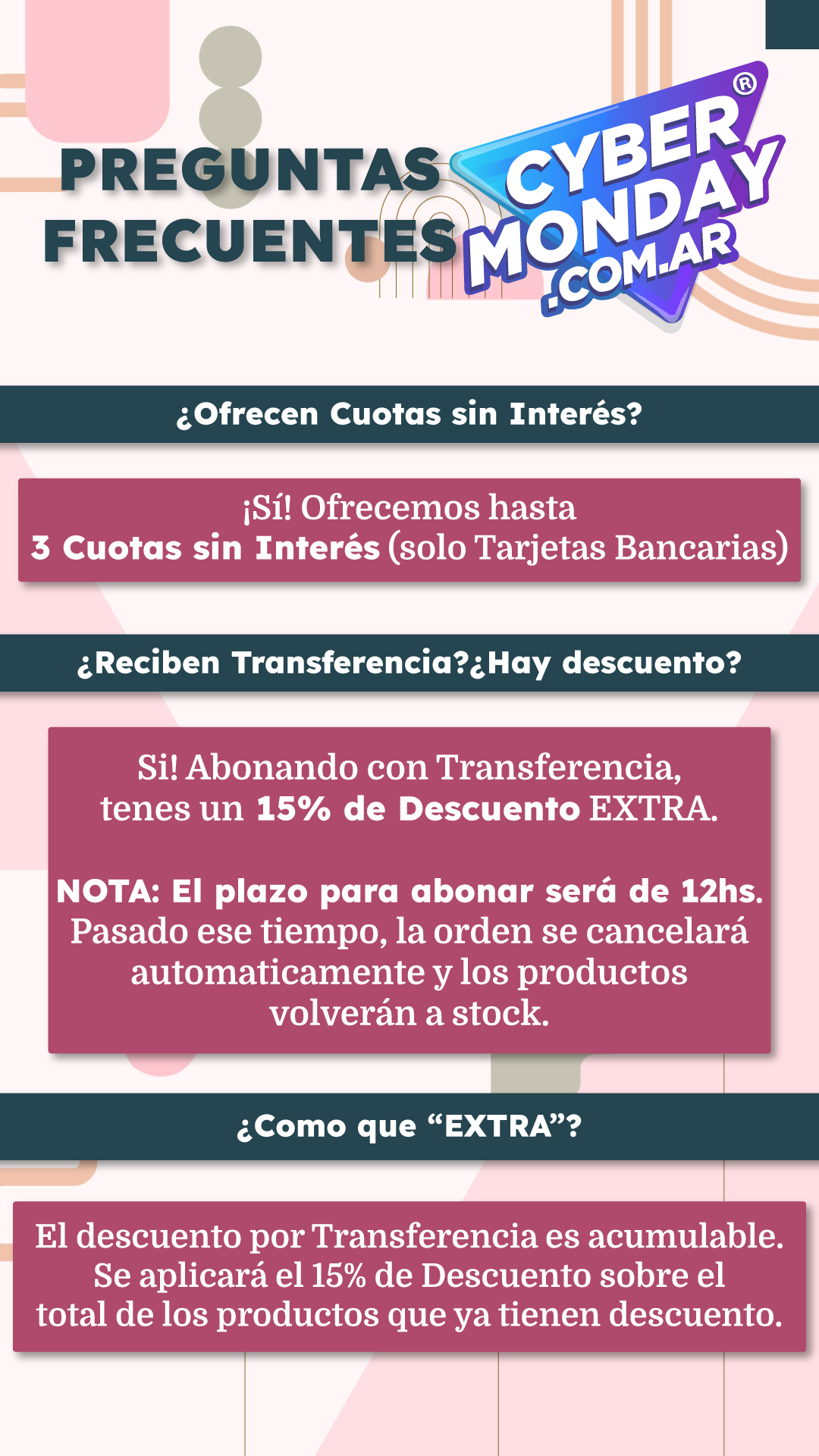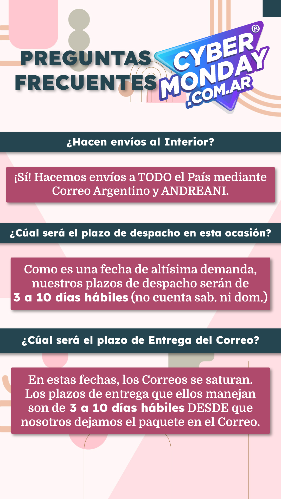 ⚡¡LLEGO EL CYBER MONDAY!⚡15% OFF EN TODA LA TIENDA ONLINE⚡ CLIC AQUÍ PARA VER TODA LA INFO DEL EVENTO 📦 ENVÍO GRATIS a SUCURSAL de Correo Argentino en compras superiores a $100 mil pesos y ANDREANI desde los $150.000 🚚